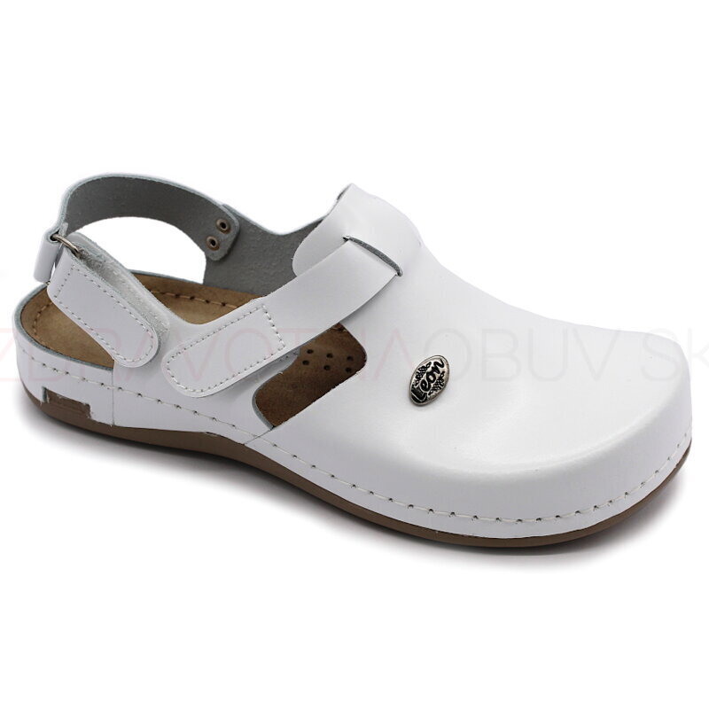 Dámske zdravotné topánky s plnou pevnou špicou. Na priehlavku a na päte je upevnenie na suchý zips. Nastaviteľný pásik (remienok) na suchý zips zaistí upevnenie vašej nohy za akýchkoľvek okolností. Obuv je kožená s tvarovanou ortopedickou perforovanou stielkou. Výplň stielky je pamäťová gélová stielka - podporujúca prirodzený tvar chodidla - na podporu priečnej a pozdĺžnej klenby - pre osoby s plochými nohami. Obuv má protišmykovú podrážku. Šírka obuvi je G. Obuv má certifikát pracovnej obuvi. Obuv je vhodná aj pre osoby s Hallux Valgus (vybočený palec).