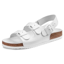 Celokožené ortopedické dámske sandále na pohodlnej platforme. Zvršok je trojprackový kožený, zabezpečuje kvalitnú oporu zo všetkých strán. Stielka je korková (prírodný korok), anatomicky tvarovaná pre podporu priečnej aj pozdĺžnej klenby. Podošva je rovná, vyrobená z tvrdeného styroporu.