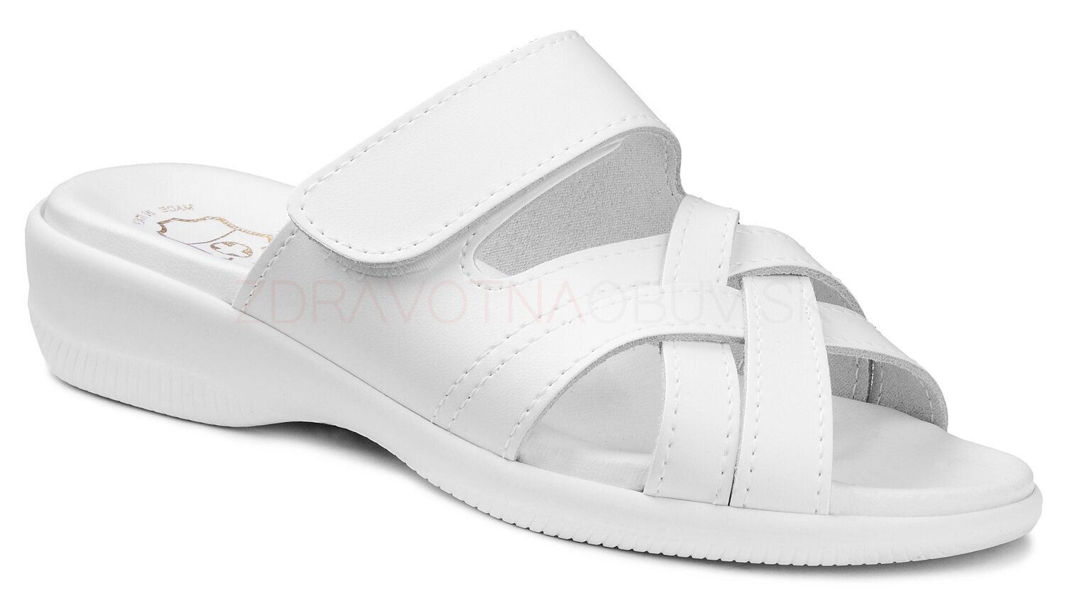 Anatomické dámske vsuvky na pohodlnej platforme. Zvršok je kožený so suchým zipsom. Stielka je mäkčená, anatomicky tvarovaná. Podošva je zvýšená, klinová s protišmykovou izolou.